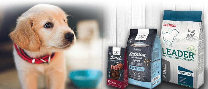 small new puppy sitting on the grass waiting for leader puppy food
